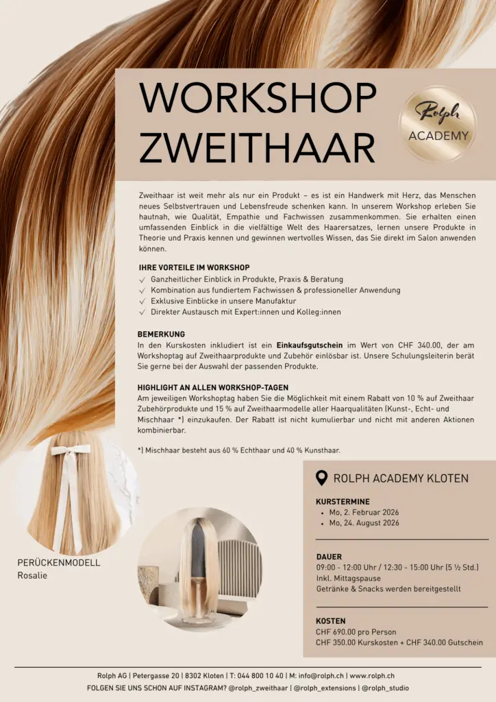 Der kleine Rolph ist ein Zweithaar-Ratgeber für Hairstylisten und Hairstylistinnen, die den Service der Zweithaar-Beratung ebenfalls anbieten möchten. Wir empfehlen die Lektüre gerne als Supplement zu unserem Basic Zweithaar Workshop.